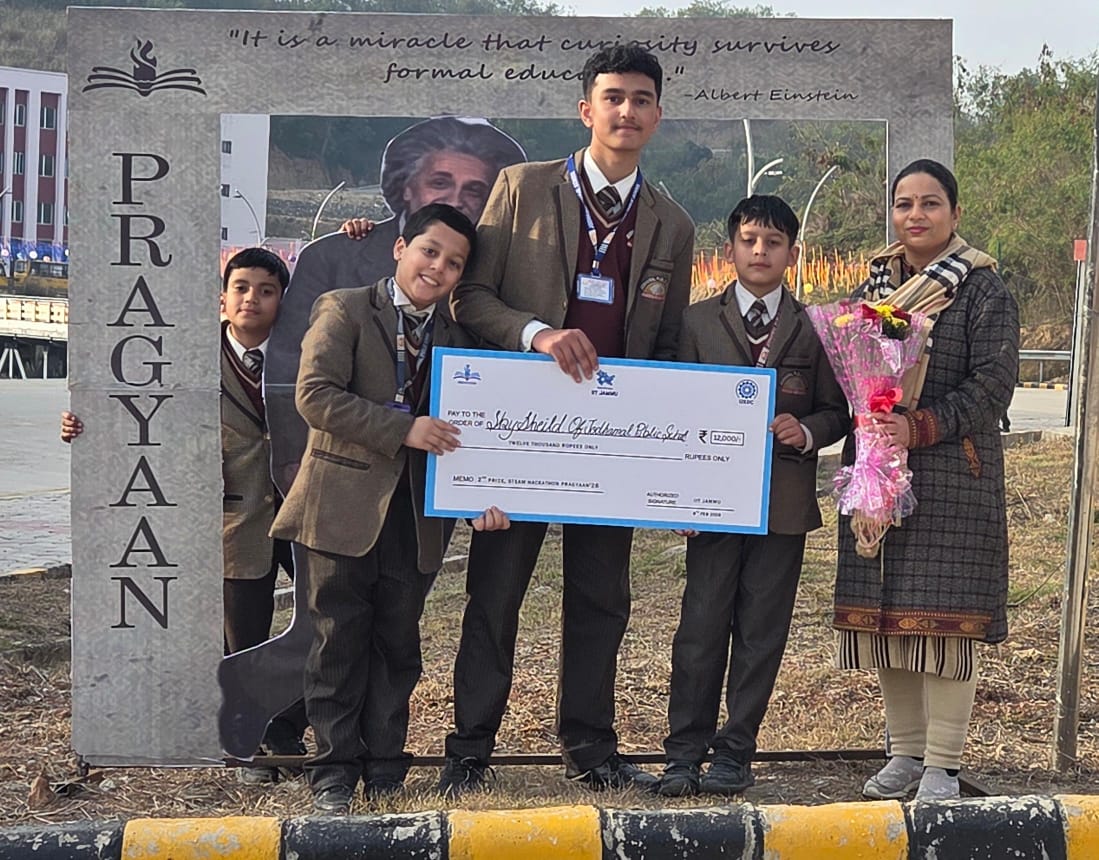 Jodhamal Public School, Channi Himmat, Jammu, has once again brought laurels to the institution with a remarkable achievement at the prestigious STEAM Innovation Challenge 2026, organized by IIT Jammu under Team Pragyaan. In a proud moment for the entire JMPS fraternity, Amay Gupta secured the Second Prize in the highly competitive innovation challenge, winning a cash award of ₹12,000, which has been credited to Jodhamal Public School. Amay Gupta’s innovative project stood out among numerous entries for its originality, practical relevance, and strong conceptual clarity. His performance reflected not only his creativity and scientific temperament but also the school’s commitment to fostering research-based learning and innovation among students. Additionally, a team from the Junior Group also proudly represented the school in the IIT STEM Innovation Challenge. The team comprised Rivan Gupta, Natik Kajoria, Prayang Arora, Krishan Gupta, Abhir Singh Bali, and Gauransh Diwan. Their enthusiastic participation, innovative thinking, and teamwork reflected the strong STEM foundation being nurtured at the junior level. The STEAM Innovation Challenge 2026 aimed to encourage young minds to apply the principles of Science, Technology, Engineering, Arts, and Mathematics (STEAM) to develop innovative solutions for real-world challenges, with strong local relevance to Jammu & Kashmir. The competition focused on four major thematic tracks: Sustainability (Eco-Conscious Innovation), Healthcare (Holistic HealthTech), Smart Living (Urban & Rural Future), and Education (Next-Gen EdTech). The event witnessed enthusiastic participation from various schools, with shortlisted teams required to present their ideas through working prototypes, detailed models, and comprehensive presentations during the two-day on-campus event held at IIT Jammu. The school management extended heartfelt congratulations to Amay Gupta and for his outstanding accomplishment. The school also acknowledged the dedicated mentorship and guidance provided by the teacher mentor Ms. Neetu Johri, whose support played a vital role in shaping the project. This achievement marks yet another milestone in JMPS’s journey of excellence in academics, innovation, and co-curricular pursuits. The entire JMPS community celebrates this success and wishes these young champions continued achievements in their future endeavors.