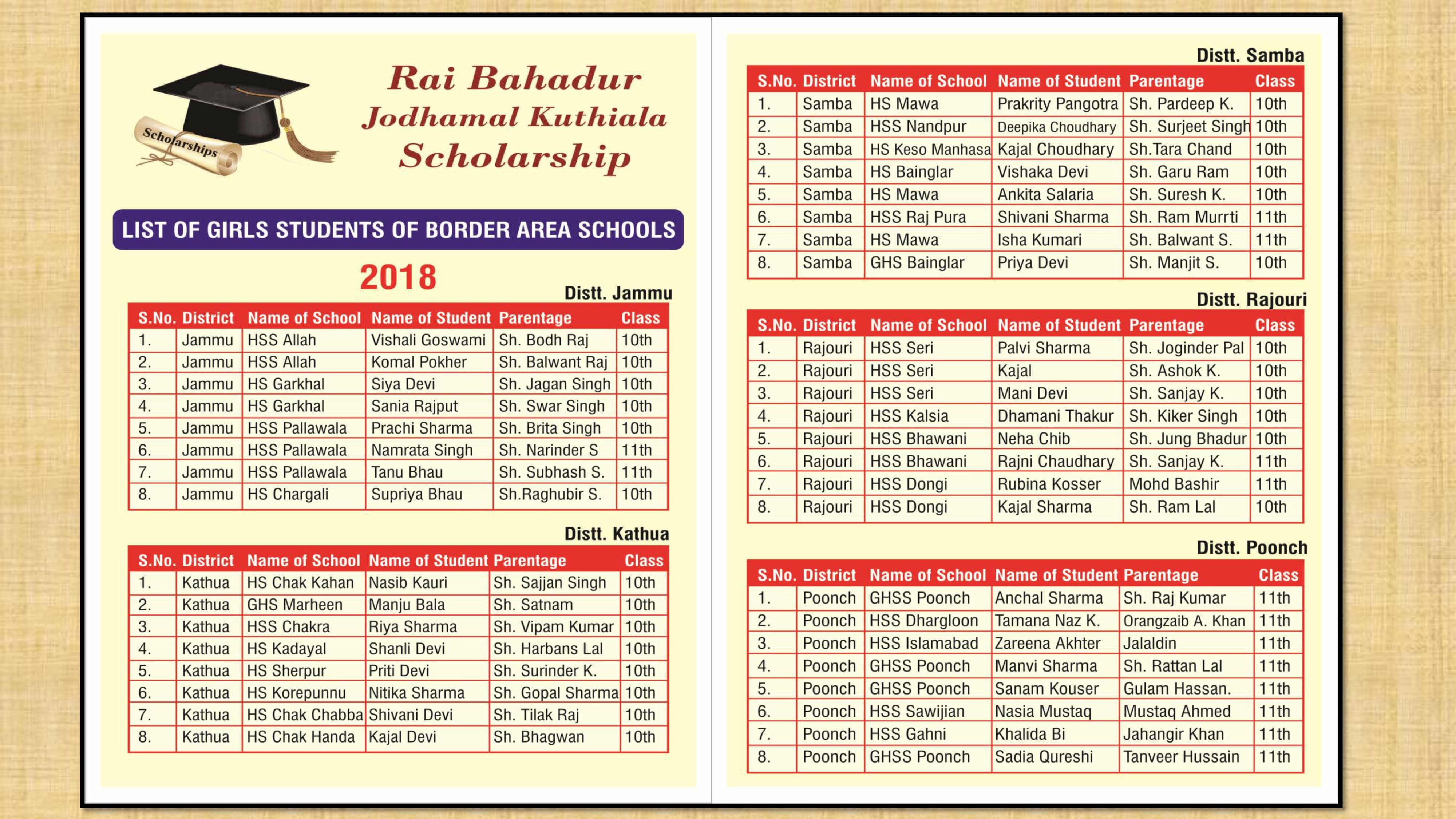 Trustee of Jodhamal School, Mr. NandanKuthiala thanked the secretary Education, Mr. Farooq Ahmed Shah, IAS, Director Education, Mr. Rakesh Srangal, KAS & Joint Director Edcuation, Mr. Charandeep Singh, KAS for their assistance in formulating the list of scholarship winners from the remote areas of the state.